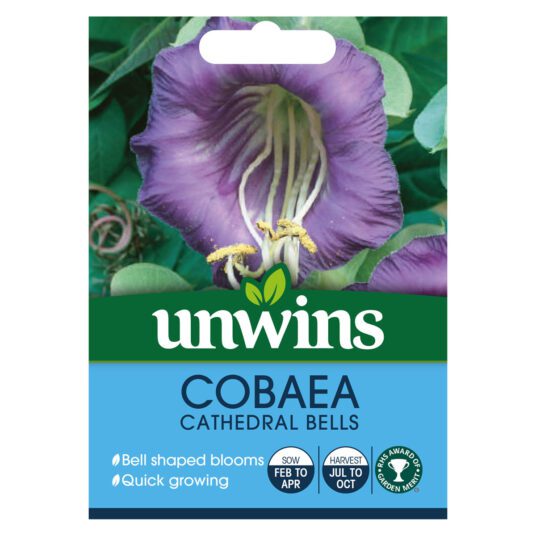 Unwins Cobaea Cathedral Bells Seeds produce a spectacular, fast-growing climber that quickly covers trellises, fences, and arbours with ease. This self-twining half hardy annual is loved for its abundance of velvety, lavender-blue bell-shaped flowers, each with a gentle fragrance that adds extra appeal through summer and early autumn. Ideal for creating height and privacy in the garden, it can be sown indoors from February to April and rewards you with striking purple blooms from July right through to October.