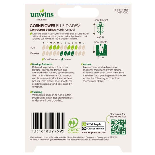 Unwins Cornflower Blue Diadem Seeds produce a striking cornflower variety packed with layers of petals that form a soft, powder-puff shape in an intense, vivid blue. Free-flowering and full of impact, these hardy annuals create a sea of bold colour through the summer months. Easy to grow and loved by pollinators, they are ideal for borders, wildlife gardens, and cutting, bringing both beauty and beneficial insects into your garden.
