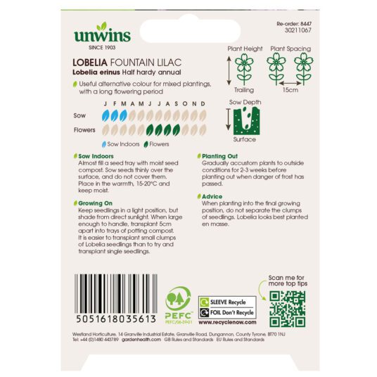 Unwins Lobelia Fountain Rose seeds produce a beautiful cascade of soft lilac-purple flowers that trail gracefully from containers and hanging baskets. Flowering from late spring through to autumn, this half hardy annual creates a long-lasting display with masses of delicate blooms. Ideal for adding colour and movement to patios and balconies, seeds can be sown indoors from January to March for earlier flowers, with plants blooming from June right through to September.