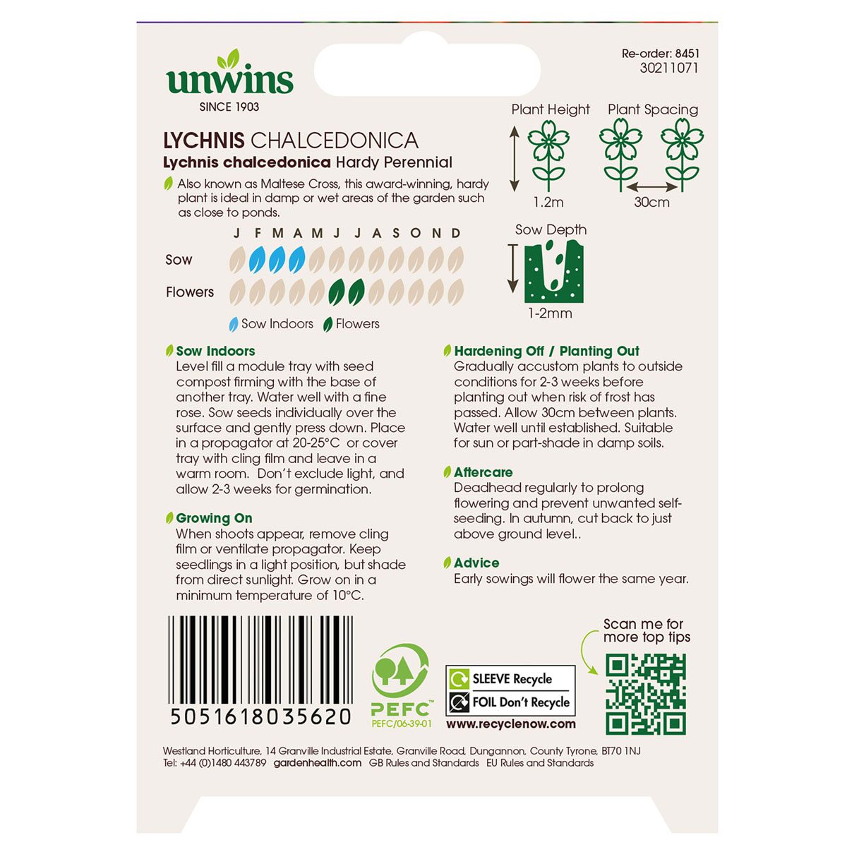 Unwins Lychnis chalcedonica seeds produce striking domed clusters of glowing scarlet-red flowers held on tall, sturdy stems, bringing bold colour and structure to summer borders. This hardy perennial thrives in damp soil and is a favourite with pollinators, making it a great choice for wildlife-friendly gardens. Sow indoors from February to June for best results and enjoy vibrant blooms from June through to September year after year.