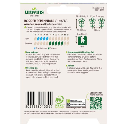 Unwins Mixed Border Perennials Cottage Garden Seeds make it easy to create a classic cottage garden look from a single sowing. This carefully selected mix of much-loved hardy perennials produces flowers in the first year when sown early, then returns year after year with a long-lasting display of colour throughout summer. Ideal for filling borders with texture and charm, these seeds can be sown indoors from February to May and will reward you with blooms from June right through to October.
