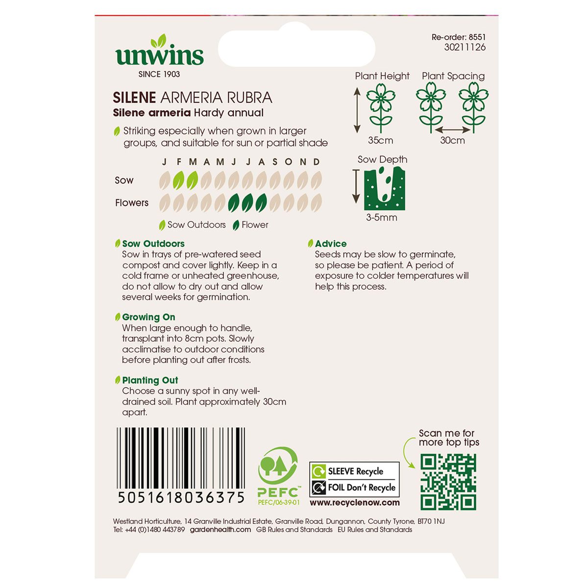 Unwins Silene Armeria Rubra produces striking clusters of vivid deep pink flowers set against attractive grey-green foliage. Perfect for creating bold splashes of colour, this hardy annual looks especially impressive when planted in large groups and will happily self-seed for displays year after year. Easy to grow and reliable, it can be sown indoors or outdoors from February to March and will reward you with bright, cheerful blooms throughout June, July and August.