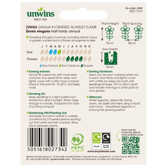 Unwins Zinnia Dahlia Flowered Scarlet Flame Seeds produce dazzling double blooms with real impact, bringing lasting colour and style to summer borders and cut flower arrangements. These half hardy annuals are easy to grow and reward you with bold pink flowers from mid to late summer. Sow indoors in March or April, or outdoors in May, and enjoy a vibrant display from July right through to October, perfect for adding brightness to beds, borders, and bouquets.