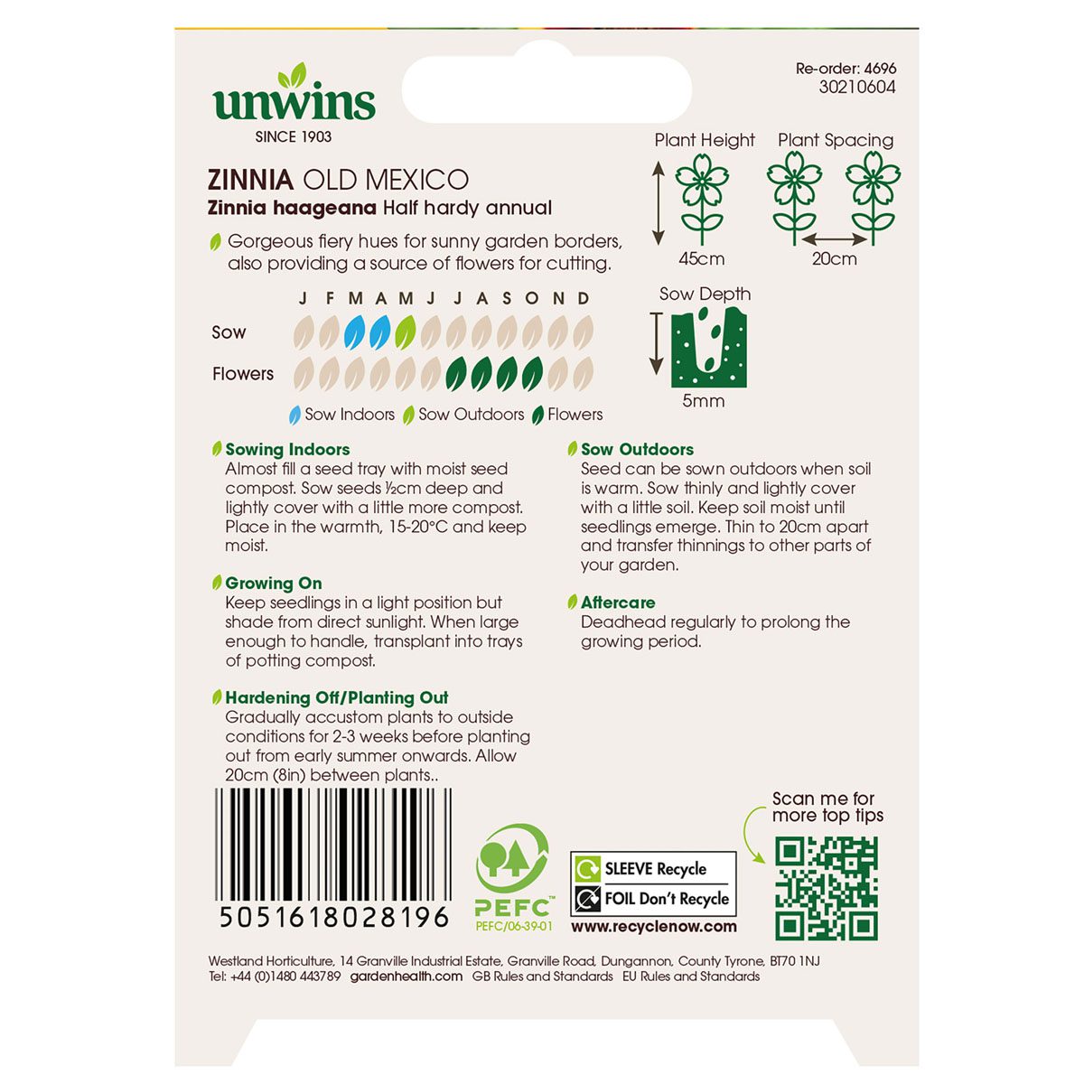 Unwins Zinnia Old Mexico Seeds produce striking blooms in fiery chilli reds and warm golden yellows, adding rustic charm to beds and borders throughout summer. Easy to grow and full of character, these half hardy annuals are also ideal for cut flowers, letting you enjoy their vibrant colour indoors as well as out. Sow indoors in March or April, or outdoors in May, and enjoy a long flowering season from July through to October.