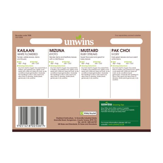 Unwins Salad Spicy Collection Seeds offer a vibrant mix of oriental leaves with a delightful kick, perfect for adding flavour to your salads and stir-fries. This easy-to-grow collection includes Kailaan White Flowered, Mizuna Kyoto, Mustard Ruby Streaks, and Pak Choi Ivory, providing a variety of textures and colours throughout the season. Sown from June to October, these hardy greens thrive in home gardens, giving you a continuous harvest of fresh, spicy leaves straight from your plot.