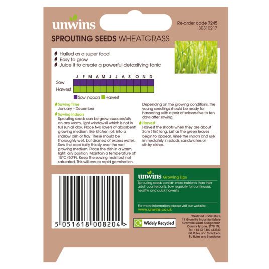 Unwins Wheatgrass Sprouting Seeds are a simple way to grow your own superfood at home. Packed with minerals, vitamins, enzymes, amino acids, and chlorophyll, wheatgrass makes a powerful detoxifying tonic when juiced. Easy to sprout indoors throughout the year, these seeds produce vibrant green shoots that are perfect for adding a healthy boost to your daily routine.
