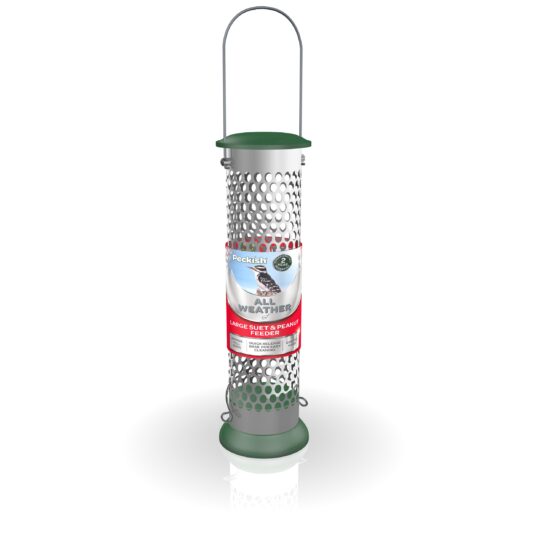 Peckish All Weather Suet and Peanut Feeder is perfect for feeding suet treats and wild bird peanuts, the small perforated holes in the stainless steel tube make it easy for bird to cling to the side and remove their favourite food. This feeder has a tough metal design and a stainless steel tube to withstand the elements. It has a broad handle so you can hook it over branches large and small, or on purpose-built hooks. The quick release base ensures easy removal for cleaning. Strong stainless steel construction. Designed to withstand all elements. Strong and durable. Suitable for all year round use.