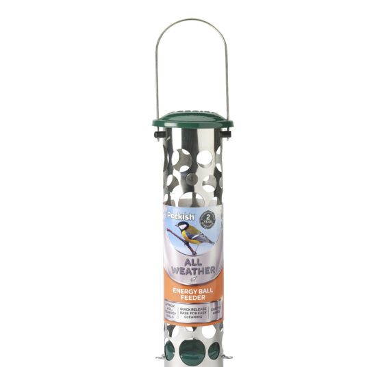 Peckish All Weather Energy Ball Feeder is perfect for feeding energy balls through the decorative cut out holes, the different sized holes allow many birds to feed at once. This feeder has a tough metal design and a stainless steel tube to withstand the elements. It has a broad handle so you can hook it over branches large and small, or on purpose-built hooks. The quick release base ensures easy removal for cleaning. Strong stainless steel construction. Designed to withstand all elements. Strong and durable. Suitable for all year round use.